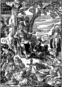Description: John the Baptist, wearing camel skin, is preaching repentance in the wilderness of Judea when Jesus meets him. Includes the monogram of the woodcutter, Christoffel van Sichem II (1577-1658); his son, Christoffel van Sichem III (1618-1659), may have collaborated with him on these images. The image also includes an engraver’s knife in the bottom left corner.