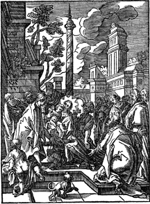 Description: Jesus instructs his disciples to welcome the little children. Includes the monogram of the woodcutter, Christoffel van Sichem II (1577-1658); his son, Christoffel van Sichem III (1618-1659), may have collaborated with him on these images.