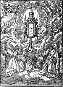 Description: A monstrance presented in Heaven flanked by two angels carrying censors. Includes the monogram of the woodcutter, Christoffel van Sichem II (1577-1658) in the top left corner; his son, Christoffel van Sichem III (1618-1659), may have collaborated with him on these images.