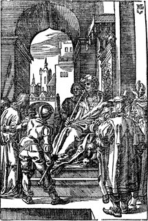 Description: Jesus is tried before Pilate. Includes the monogram of the woodcutter, Christoffel van Sichem II (1577-1658); his son, Christoffel van Sichem III (1618-1659), may have collaborated with him on these images. The image also inlcudes the engraver's initials (HG) in the top right corner.