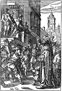 Description: Jesus, who wears a crown of thorns, a robe, and holds a reed, is presented to Pilate and the crowd who brings out a cross for him to carry. Includes the monogram of the woodcutter, Christoffel van Sichem II (1577-1658); his son, Christoffel van Sichem III (1618-1659), may have collaborated with him on these images. This image also includes the engraver's intials (HG) in the bottom left corner.