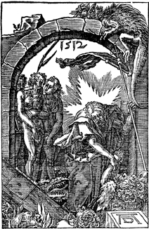 Description: The Harrowing of Hell is depicted as Jesus, holding the resurrection banner, breaks down the gates of Hell and reaches down to rescue the souls in Hell. A devil thrusts a spear at Adam and Eve in the background. Underneath the gate is the year 1512. Includes the monogram of the woodcutter, Christoffel van Sichem II (1577-1658) in the top left corner; his son, Christoffel van Sichem III (1618-1659), may have collaborated with him on these images. The stone at the lower right corner has the monogram of Albrecht Dürer.