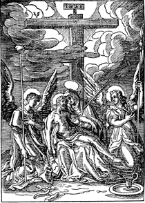 Description: Mary the mother of Jesus holds the limb body of her son as two angels flank her. One angel holds the spear, whip, and nails used on Jesus, while the other angel holds a reed with a sponge and the crown of thorns. In the background is the cross with a sign that reads “INRI.” Includes the monogram of the woodcutter, Christoffel van Sichem II (1577-1658) near the top left corner; his son, Christoffel van Sichem III (1618-1659), may have collaborated with him on these images.