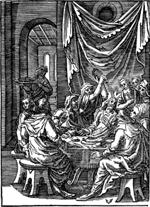Description: A woman anoints Jesus' head with perfume, while he eats at the home of Simon the leper in Bethany. Includes the monogram of the woodcutter, Christoffel van Sichem II (1577-1658); his son, Christoffel van Sichem III (1618-1659), may have collaborated with him on these images.