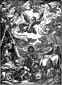 Description: An angel tells shepherds of the birth of Jesus. Includes the monogram of the woodcutter, Christoffel van Sichem II (1577-1658) in the upper right corner of the image; his son, Christoffel van Sichem III (1618-1659), may have collaborated with him on these images.