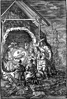 Description: Shepherds visit the newborn Jesus after learning of his birth from an angel. Includes the monogram of the woodcutter, Christoffel van Sichem II (1577-1658) in the center; his son, Christoffel van Sichem III (1618-1659), may have collaborated with him on these images.