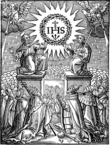 Description: Depiction of Simeon’s prophecy that Jesus will be a light to the Gentiles. At the head, encircled by a crown of thorns, is the monogram of Christ “IHS” with a cross on top of the H and three arrows below. Two angels blow trumpets above as the crown of thorns is held up by Peter, on the left who holds a key, and another man who holds a sword; both are situated on pedestals. At the base kneels the Pope with the triple tiered tiara and the church on the left and the kings of the world on the right. Between the Pope and the King are a globus cruciger and sword. Includes the monogram of the woodcutter, Christoffel van Sichem II (1577-1658) at the base; his son, Christoffel van Sichem III (1618-1659), may have collaborated with him on these images.