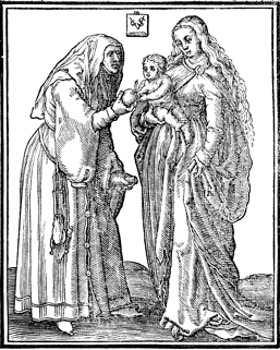 Description: Anna, a prophetess of the tribe of Asher, holds out a fruit to the infant Jesus who is being held by Mary. Includes the monogram of the woodcutter, Christoffel van Sichem II (1577-1658); his son, Christoffel van Sichem III (1618-1659), may have collaborated with him on these images.The image also includes an engraver’s knife at the head.