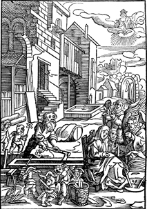 Description: Mary and Joseph work while Jesus is rocked in a crib as God watches from the top right corner. The Father, Son, and Holy Spirit are represented as God holding a cross and a dove descending. Includes the monogram of the woodcutter, Christoffel van Sichem II (1577-1658); his son, Christoffel van Sichem III (1618-1659), may have collaborated with him on these images, near the lower right corner.