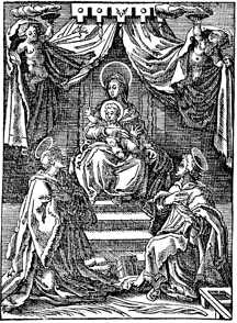 Description: Madonna and child are enthroned and worshipped by two saints. The monogram of the artist, Christoffel van Sichem (1546-1624), appears at the top center.