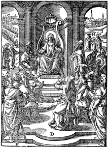 Description: This complex images uses an alphabetic key to identify various scenes within the story of Jesus and his parents’ visit to Jerusalem in Luke 2:41-52. The central element is Jesus in the temple, sitting among the teachers, listening and asking questions.