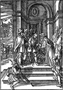 Description: The prodigal son asks his father for his inheritance. Includes the monogram of the woodcutter, Christoffel van Sichem II (1577-1658); his son, Christoffel van Sichem III (1618-1659), may have collaborated with him on these images.
