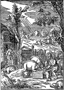 Description: The prodigal son tends pigs. Includes the monogram of the woodcutter, Christoffel van Sichem II (1577-1658); his son, Christoffel van Sichem III (1618-1659), may have collaborated with him on these images.