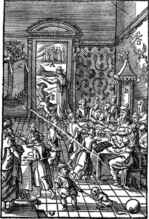 Description: Lazarus sits at the gate of the rich man, who lives in luxury. Includes the monogram of the woodcutter, Christoffel van Sichem II (1577-1658); his son, Christoffel van Sichem III (1618-1659), may have collaborated with him on these images.
