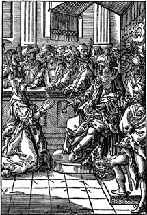 Description: A widow pesters an unjust judge for justice. The the monogram of the artist, Christoffel van Sichem, (1546-1624), and engraver's knife are located in the lower left corner of the image.