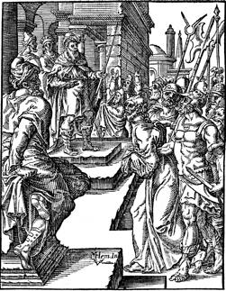 Description: Jesus is presented before the Sanhedrin. The monogram of the artist, Christoffel van Sichem (1546-1624), as well as the engraver’s initials, MHems, and the engraver's knife appear in the center lower portion of the image.