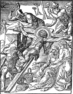 Description: Jesus is lifted up on the cross. A man behind Jesus prepares to place a sign on the cross that reads “INRI.” The image is accompanied by citations of Song of Solomon 7, Zechariah 13, and Psalm 21. The monogram of the artist, Christoffel van Sichem (1546-1624), engraver's knife and initials, MHem., are located in the upper left corner of the image.