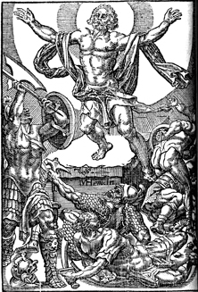 Description: The resurrected Jesus appears to the guards at the tomb. The scene reflects Matthew 28 and later tradition rather than the text of Luke. The image is accompanied by citations of Esther 16 (Apocrypha) and Psalm 27. The monogram of the artist, Christoffel van Sichem (1546-1624), engraver's knife, and initials, MHem., are located in the center of the image.