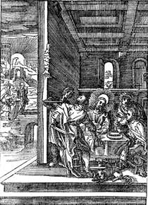 Description: Jesus converses with Cleopas and another disciple on the road to Emmaus (background), and then is recognized in the breaking of the bread. The the monogram of the artist, Christoffel van Sichem (1546-1624), is in the center portion of the image.
