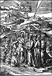 Description: While John is baptizing men in the Jordan River, Jewish priests and Levites question him if he is the Christ, Elijah, or a prophet the background, Elijah ascends to Heaven in a fiery chariot and leaves his mantle for Elisha.