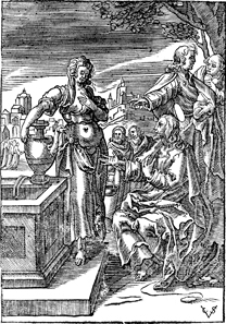 Description: Jesus speaks with the Samaritan woman at the well in Sychar. Includes the monogram of the woodcutter, Christoffel van Sichem II (1577-1658); his son, Christoffel van Sichem III (1618-1659), may have collaborated with him on these images, in the bottom right corner.