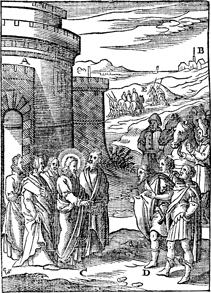Description: Series of images illustrating Jesus telling the official that his son has been made well and the official being greeted by his slaves who confirm this news. The monogram of the artist, Christoffel van Sichem (1546-1624), appears at lower left.