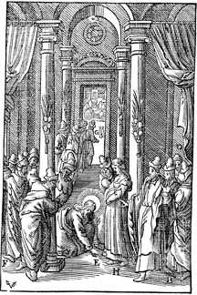 Description: Series of images that illustrate the trial of the adulterous woman. In the foreground Jesus is presented with a woman who has been caught in the act of adultery, while in the background the scribes and Pharisees leave the temple. The monogram of the artist, Christoffel van Sichem (1546-1624), appears at the lower left.