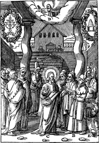 Description: Jesus is accused of blasphemy by his Jewish opponents and narrowly escapes stoning, as God (who holds a globus cruciger) looks on from above. On the top left is a lampstand and on the top right is the table with bread of presence. Includes the monogram of the woodcutter, Christoffel van Sichem II (1577-1658); his son, Christoffel van Sichem III (1618-1659), may have collaborated with him on these images.