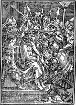 Description: The soldiers mock Jesus, as they place on him a robe, a crown of thorns, and in his hand a reed for a scepter. Includes the monogram of the woodcutter, Christoffel van Sichem II (1577-1658); his son, Christoffel van Sichem III (1618-1659), may have collaborated with him on these images, in the top left corner.