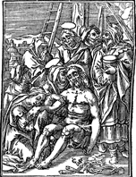 Description: Joseph of Arimathea removes Jesus' body from the cross. The monogram of the artist, Christoffel van Sichem (1546-1624), appears at the bottom in the middle.