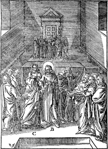 Description: Jesus appears to his disciples after resurrection, and Thomas touches the wound in his side. In the background the disciples assemble in fear before Jesus arrives. Image Includes the monogram of the woodcutter, Christoffel van Sichem II (1577-1658); his son, Christoffel van Sichem III (1618-1659), may have collaborated with him on these images, at the lower left bottom.