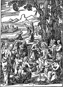 Description: Jesus has breakfast with his disciples after the miraculous catch of fish. Image Includes the monogram of the woodcutter, Christoffel van Sichem II (1577-1658); his son, Christoffel van Sichem III (1618-1659), may have collaborated with him on these images at the upper right corner.