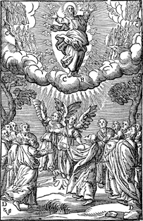 Description: Jesus ascends to heaven in a cloud, while the disciples look on. Includes the monogram of the woodcutter, Christoffel van Sichem II (1577-1658); his son, Christoffel van Sichem III (1618-1659), may have collaborated with him on these images, in the bottom left corner.