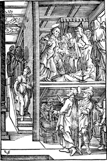 Description: Peter raises Tabitha/Dorcas from the dead in Joppa. His attribute, the key, is in his hand. Includes the monogram of the woodcutter, Christoffel van Sichem II (1577-1658); his son, Christoffel van Sichem III (1618-1659), may have collaborated with him on these images, in the bottom left corner.