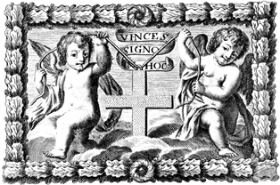 Description: Two putti hold a cross with the inscription "In this sign you will conquer above.".
