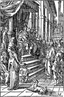 Description: Paul makes his defense before Agippa. Includes the monogram of the woodcutter, Christoffel van Sichem II (1577-1658); his son, Christoffel van Sichem III (1618-1659), may have collaborated with him on these images, in the bottom right corner.