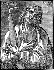Description: The Apostle Simon with his attribute, the saw. Includes the monogram of the woodcutter, Christoffel van Sichem II (1577-1658); his son, Christoffel van Sichem III (1618-1659), may have collaborated with him on these images, in the top right corner.