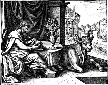 Description: St. Luke writes his gospel with his attribute, the bull, nearby.