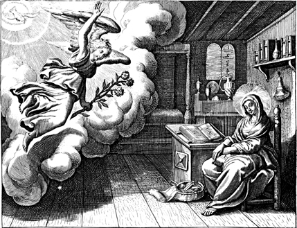 Description: The angel Gabriel visits Mary and announces that she will give birth to Jesus.