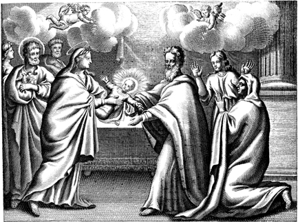 Description: When Mary and Joseph present the baby Jesus at the temple, Simeon and Anna bless him.