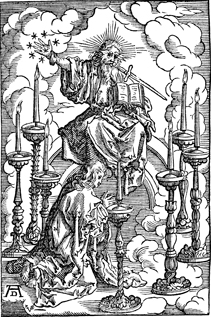 Description: John's vision of the one like the son of man among the seven golden lampstands. John bows at his feet. Includes the monogram of the woodcutter, Christoffel van Sichem II (1577-1658); his son, Christoffel van Sichem III (1618-1659), may have collaborated with him on these images, the monogram of Albrecht Dürer (1471-1528), and an engraver’s knife in the bottom left corner.