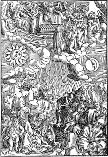 Description: Upon the opening of the fifth seal, angels give the saints under the altar white robes(top). Upon the opening of the sixth seal, a third of the sun, moon, and stars are destroyed (bottom). Includes the monogram of the woodcutter, Christoffel van Sichem II (1577-1658); his son, Christoffel van Sichem III (1618-1659), may have collaborated with him on these images, the monogram of Albrecht Dürer (1471-1528), and an engraver’s knife at the base.