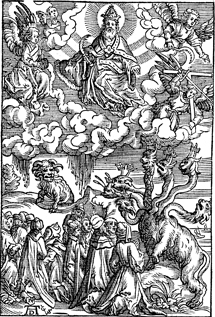 Description: God looks on with pruning hook in hand as all the people of earth, whose names are not in the book of life, worship the seven-headed beast emerging from the sea, as another beast emerges from the earth. The monograms of the artist, Christoffel van Sichem (1546-1624), Albrecht Dürer (1471-1528), and engraver’s knife are located at the bottom left.