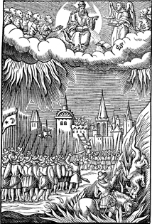 Description: The saints whose names are in the book of life (top) are spared from the final judgment (bottom). The monogram of the artist, Christoffel van Sichem (1546-1624) is located in the clouds at the top.