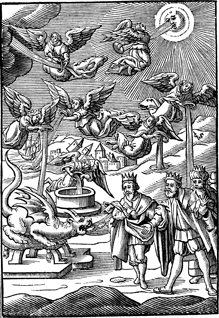 Description: The seven bowls of God's wrath are poured out upon the earth, as the dragon breathes evil spirits, depicted as frogs. The monogram of the artist, Christoffel van Sichem (1546-1624) is located in the right margins.