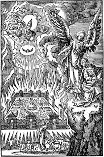 Description: An angel reveals to John the new heavenly Jerusalem. The monogram of the artist, Christoffel van Sichem (1546-1624), is located in the right margins.
