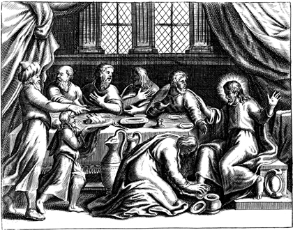 Description: An adulterous woman, identified as Mary Magdalene, dries Jesus' feet with her hair, as Jesus eats dinner with a group of Pharisees.
