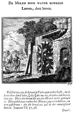 Description: A waterwheel is turned by water that falls on it from a stream above. On the left two men with a donkey discuss the mill; next to them are two large sacks filled with flour; three sacks filled with flour lean against a wall of the mill on the right foreground. The miller can be seen through a window in the wall. The Dutch artist and poet Jan Luiken (1649-1712), whose initials are at the lower right, was responsible for drawing and etching this emblem, as well as for the poem that accompanies it (below). The attendant Scripture text is John 6:57-58.