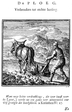 Description: A farmer, carrying a whip, tills his field with a plow pulled by a horse. The Dutch artist and poet Jan Luiken (1649-1712), whose initials are at the lower right, was responsible for drawing and etching this emblem, as well as for the poem that accompanies it (below).