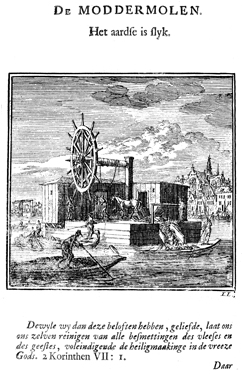 Description: A large, horse-powered dredge mill is located on a boat and in the process of dredging sludge from the bottom of a canal; the sludge is deposited in small boats and taken away. A cityscape is visible on the far side of the canal. The Dutch artist and poet Jan Luiken (1649-1712), whose initials are at the lower right, was responsible for drawing and etching this emblem, as well as for the poem that accompanies it (below).